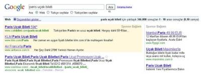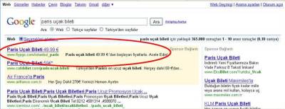 2. AdWords Reklamları: Yine Google.com.tr de “paris uçak bileti” aramasını yapıyorum ve Pegasus’un Adwords reklamı sponsor bağlantılarda 4. sırada yer alıyor.