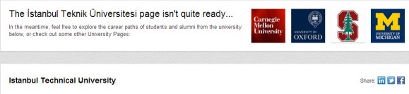20.08.2013, Güncelleme: İTÜ’nin resmi twitter hesabı @itu1773’den gelen tweet’de İTÜ’nin şirket sayfasının ve üniversite sayfasının açık olduğu yazıyordu. İTÜ’nün tweetime hızlı cevap vermesi sosyal medyaya verdikleri önem bakımından güzel, ancak http://www.linkedin.com/edu/istanbultechnicaluniversity adlı sayfanın içeriği henüz boş. Umarım en kısa sürede mezunlar hakkında ayrıntılı bilgi alabileceğimiz bir sayfaya dönüşür.